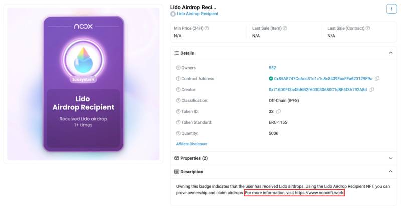 In one documented instance, users received a sham Lido NFT token, presenting itself as a "badge" to claim an airdrop.