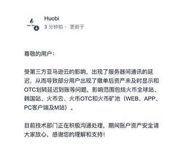 Later, Huobi officials issued a statement: the fault was affected by the third-party Amazon cloud, and there was a communication delay during the service, which led to problems for some users.