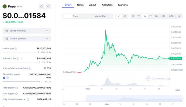 Pepe price overview, 23 May 2023, CoinMarketCap