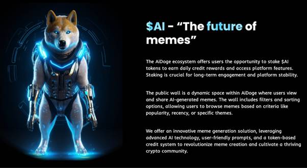 To begin with, AiDoge has its foot in three of the hottest trends of this millennium. That is AI, memes, and meme coins. The AI-powered Web 3.0 platform makes memes for you within minutes based on your text prompts. The native token $AI powers the platform’s credit, payment, and reward systems. As you can see, $AI wouldn’t just be another meme coin with no utility or purpose. It is underpinned by its integral role in the AiDoge ecosystem.